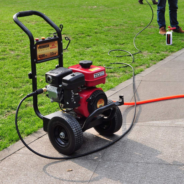 - [Better Durability] With innovative high technology material and process management, newly upgraded strength, and wear resistance. YAMATIC high-pressure washer extension hose provides a longer life for your home and commercial use to wash Cars, Driveways, etc. Tech Tip: Don't touch the gas power engine muffler because only afford 140℉/60℃, the high temperature will burn the hose in a short time.