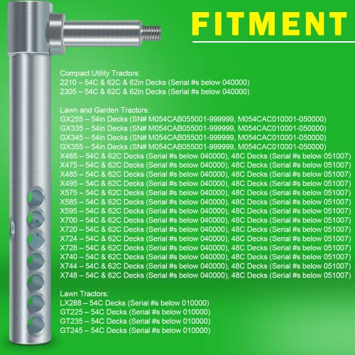 Details: Fitment Compact Utility Tractors: 2210 – 54C & 62C & 62in Decks (Serial #s below 040000) 2305 – 54C & 62C & 62in Decks (Serial #s below 040000) Lawn and Garden Tractors: GX255 – 54in Decks (SN# M054CAB055001-999999, M054CAC010001-050000) GX335 – 54in Decks (SN# M054CAB055001-999999, M054CAC010001-050000) GX345 – 54in Decks (SN# M054CAB055001-999999, M054CAC010001-050000) GX355 – 54in Decks (SN# M054CAB055001-999999, M054CAC010001-050000) X465 – 54C & 62C Decks (Serial #s below 040000), 48C Decks (Serial #s below 051007) X475 – 54C & 62C Decks (Serial #s below 040000), 48C Decks (Serial #s below 051007) X485 – 54C & 62C Decks (Serial #s below 040000), 48C Decks (Serial #s below 051007) X495 – 54C & 62C Decks (Serial #s below 040000), 48C Decks (Serial #s below 051007) X575 – 54C & 62C Decks (Serial #s below 040000), 48C Decks (Serial #s below 051007) X585 – 54C & 62C Decks (Serial #s below 040000), 48C Decks (Serial #s below 051007) X595 – 54C & 62C Decks (Serial #s below 040000), 48C Decks (Serial #s below 051007) X700 – 54C & 62C Decks (Serial #s below 040000), 48C Decks (Serial #s below 051007) X720 – 54C & 62C Decks (Serial #s below 040000), 48C Decks (Serial #s below 051007) X724 – 54C & 62C Decks (Serial #s below 040000), 48C Decks (Serial #s below 051007) X728 – 54C & 62C Decks (Serial #s below 040000), 48C Decks (Serial #s below 051007) X740 – 54C & 62C Decks (Serial #s below 040000), 48C Decks (Serial #s below 051007) X744 – 54C & 62C Decks (Serial #s below 040000), 48C Decks (Serial #s below 051007) X748 – 54C & 62C Decks (Serial #s below 040000), 48C Decks (Serial #s below 051007) Lawn Tractors: LX288 – 54C Decks (Serial #s below 010000) GT225 – 54C Decks (Serial #s below 010000) GT235 – 54C Decks (Serial #s below 010000) GT245 – 54C Decks (Serial #s below 010000)